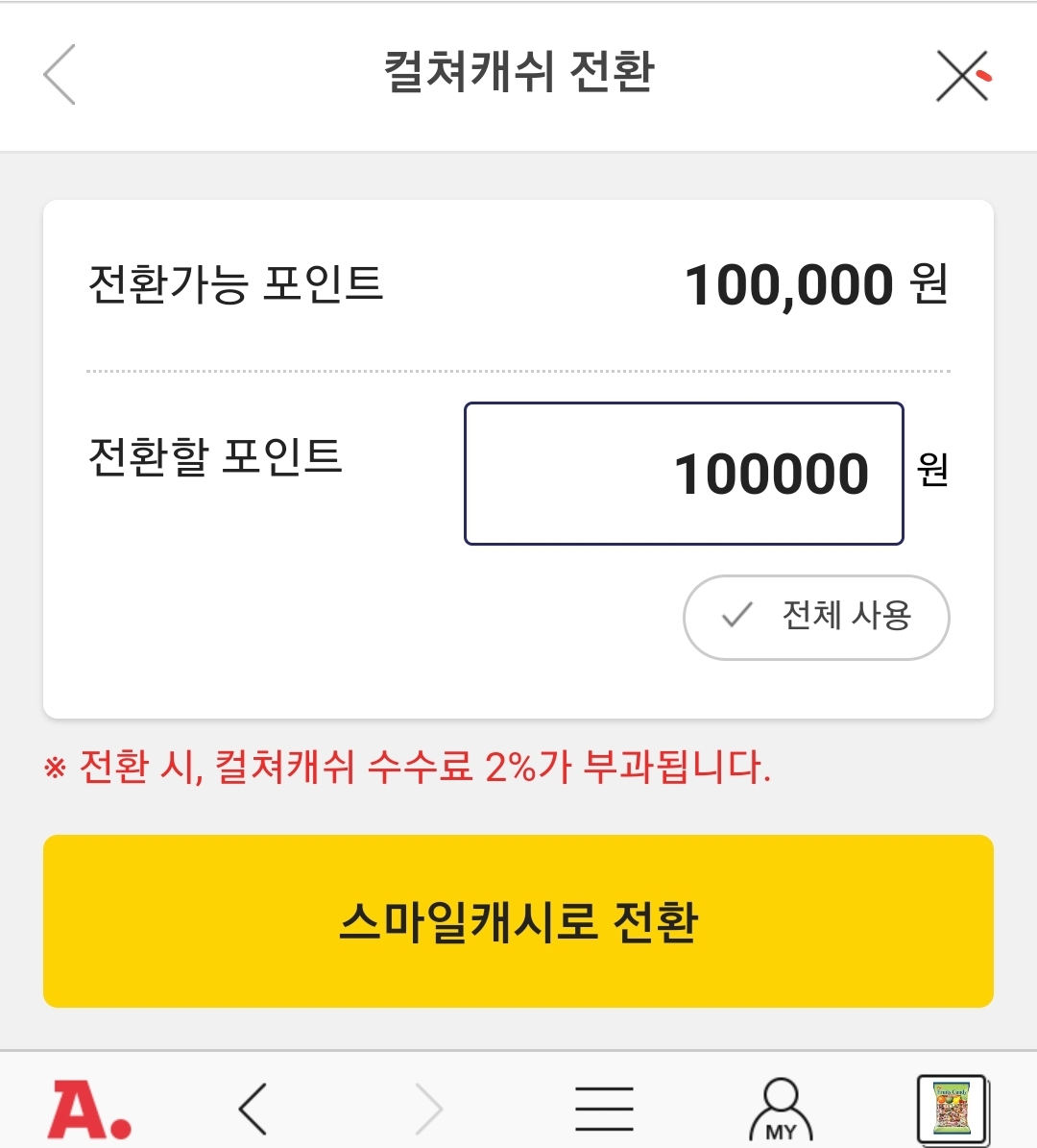 8월부터는 10만원인 대신 2%수수료를 일괄 부과합니다. 컬쳐캐시 10만 포인트를 스마일캐시 10만 포인트로 전환할 때, 컬쳐캐시에서 10만 2천 포인트가 줄어든다는 말.