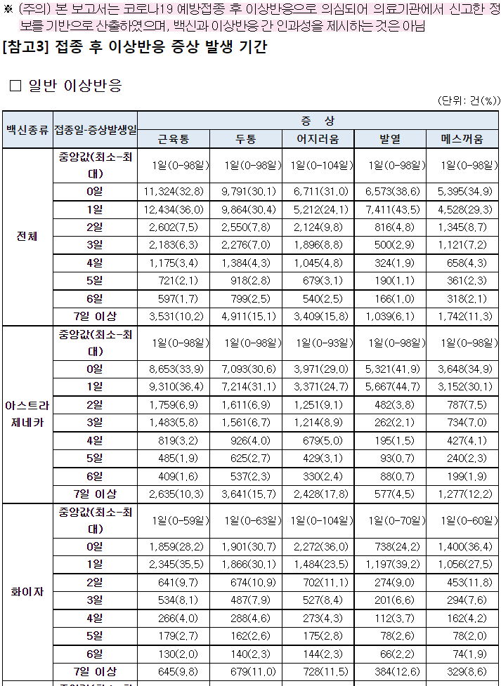 연령대별(문서의 다른 표에 성별로도 있습니다) 차이는 크지 않습니다. 일반이상반응은 젊은층이 많지만 이건 두 가지를 생각해볼 수 있습니다. 나이들수록 몸의 반응을 둔하게 느낀다, 또는 나이들수록 무덤덤하게 넘기거나 참고 만다. (단순한 신고접수집계 - 39도 이상의 고열, 며칠씩 계속되는 근육통 등을 기준삼은 - 만 가지고는 단정하기가 어려운 것 같아요) 하여튼 그런 한계를 염두에 두고 읽어가봅니다.