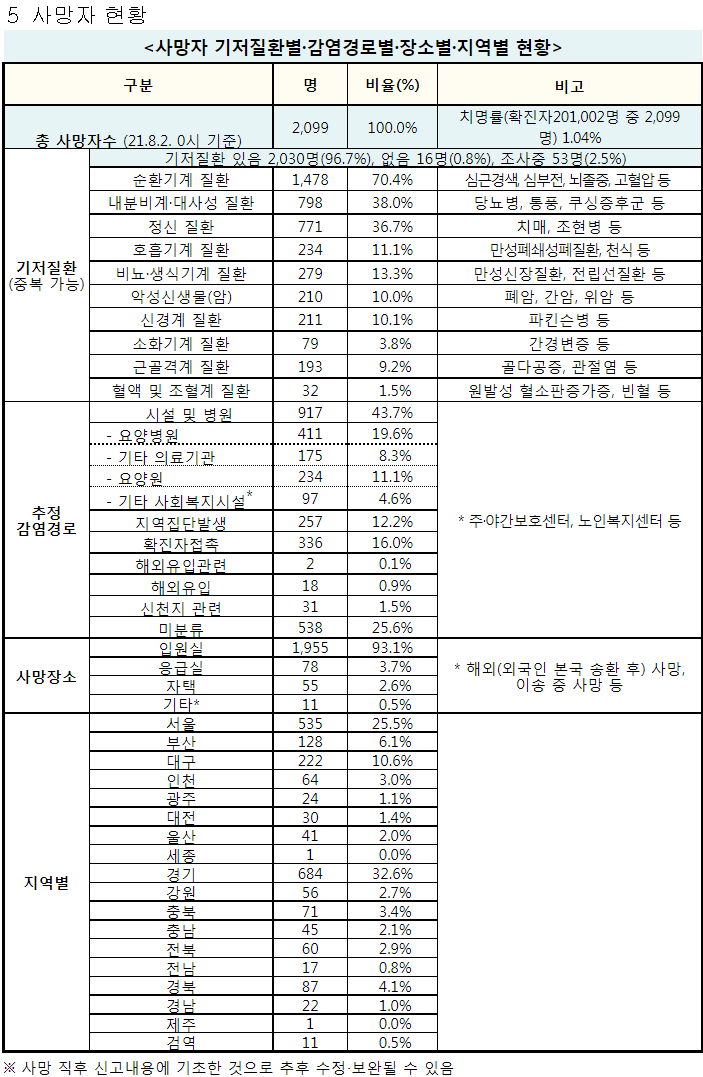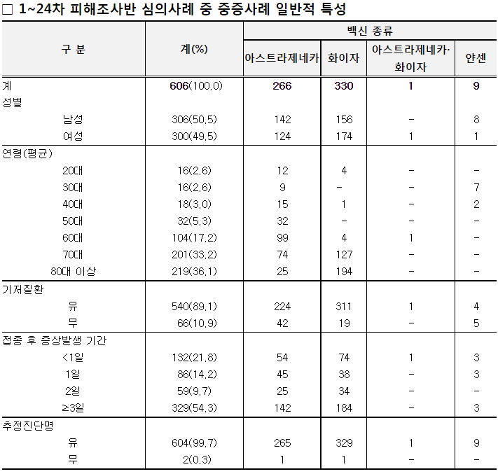사망자 거의 전원이 기저질환이 있다고 표가 만들어져있죠(아마 위중증쪽도 그럴 것 같은데요). 이것은 마치, "기저질환이 없으면 이 병은 가볍고 별 것 아니다"고 오도할 수 있습니다. 그런 논리가 확장되면, "거리두기를 왜 하느냐"는 말이 되니까 조심해야 합니다. 성인치고 웬만하면 이 병 걸려 병원가 문진할 때 '기저질환이 있다'고 말할 만한 가벼운 병 정도는 가진 사람이 많은데, 기저질환탓하면 안 된다는 말입니다. 그리고 백신접종 부작용항목에도 마찬가지로 거의 전부가 기저질환자입니다. 이 둘 다, 면책을 주장하는 용도로 악용되어서는 안 된다고 생각합니다.
