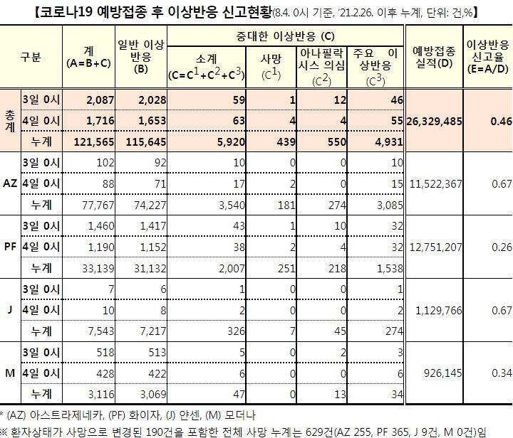 접종 약 2백건당 이상반응신고 1건(39도를 넘는 열 등 포함; 최근 연구를 인용한 기사를 하나 봤는데, 열은 그렇게 일반적이지는 않고, 통증과 피로감 등이 더 많다고 합니다. 체온계로 누구나 쉽게 잴 수 있고 그렇기에 쉽게 인정되어 접수되며, 39도를 넘는 열은 원인이 무엇이든 응급상황이기에 대표사례처럼 인용되지만)