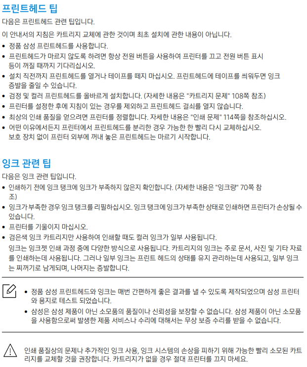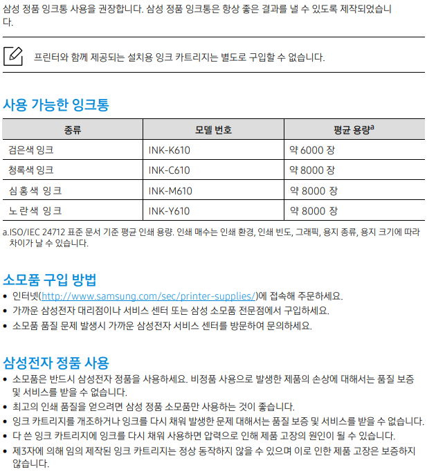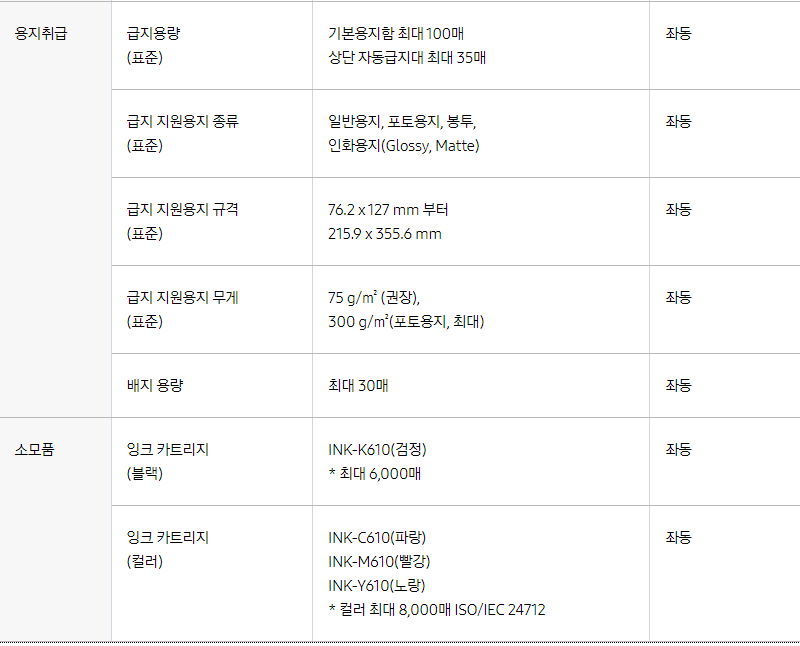 소모품항목을 보니 정품 잉크의 용량이 꽤 큰 것 같네요. 리필이나 무한잉크로 쓸 사람들이 있겠지만 일단 이건 좋은 점.