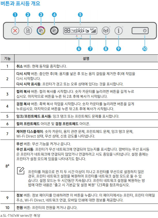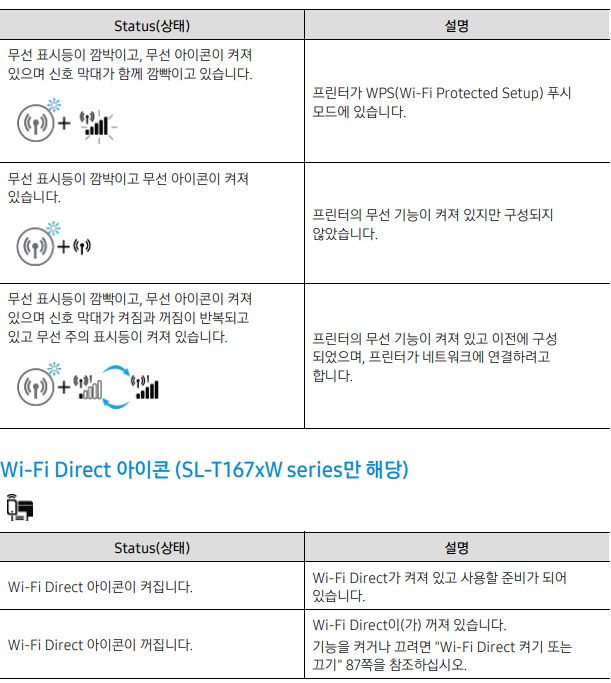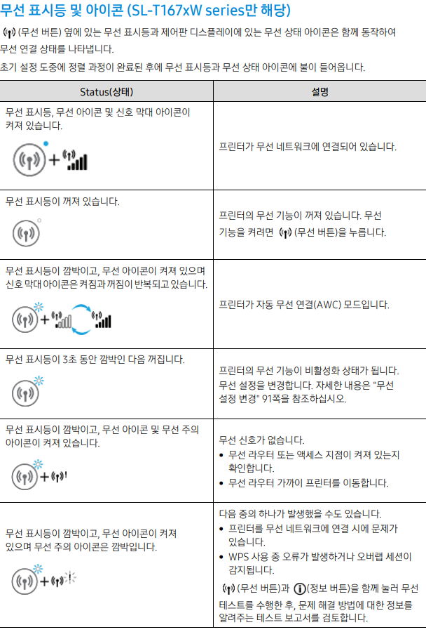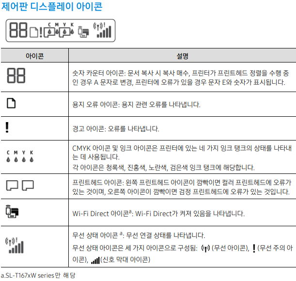 아래는 프린터 본체 제어패널 알림(지시등) 소개입니다. 설명서에 더 자세하게 나옵니다.