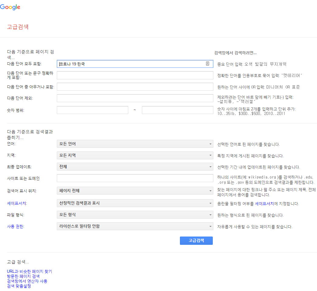 아래 링크 중 "검색창에셔 연산자 사용"이라는 게 있는데, 이것은 상당히 유용합니다.