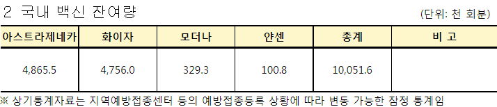 (다만, 우리나라는 백신생산공장이 있기는 해도 그건 아직까지 자체개발은 진행 중이고, 쓸 수 있는 것과 정부가 발표한 국내생산은 모조리 생산위탁이거나 포장위탁 공장일 뿐이라, 생산한 백신에 대한 권리는 우리나라에 없습니다. 따라서 권리를 가진 회사가 소속된 나라의 정부가 자국내 부스터샷 정책을 집행하면, 우리나라로 들어올 백신은 줄어들 수 있어서 연말까지는 부스트샷까지 할 여력 있을지는 다소 불확실해질 가능성이 있다는 기사가 있습니다. 그러나 다국적 제약회사들이 생산여력을 수십 배로 늘리고 있습니다. 올해 이번만 맞고 마는 게 아니라 변이바이러스의 특징을 조합해 내년판 새 백신을 전국민이 또 맞아야 합니다. 독감백신처럼, 단 독감백신과 달리 취약연령층이 아닌 전국민 의무로. 백신회사들이 생산여력을 크게 늘리는 이유 중 하나기도 합니다.)