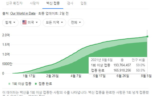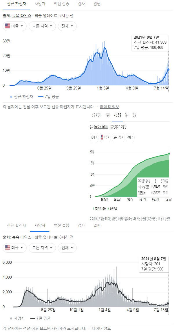 그동안 미국은 접종률이 꽤 올랐다가 정체된 상태였습니다. 왜냐 하면 "백신을 맞지 않겠다"는 신조를 가진 사람들이 안 맞고 버텼기 때문인데, "백신맞으면 걸려도 가볍게 앓고, 감염도 잘 안 된다"는 연구가 누적되고, 또 델타변이문제가 공포를 불러(안 맞고 버틴 인구가 많은 주에서 새로 걸린 사람이 많아 병상부족현상이 다시 생길 정도가 됐다고) 이 사람들이 백신맞겠다며 움직이기 시작했다네요.