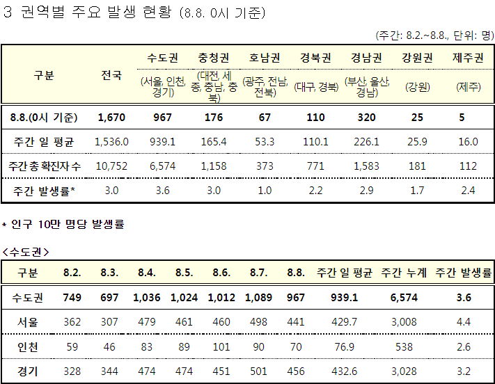 수도권(서울 경기 인천)은 988명 (지역인구 2592.6만 명/ 면적 1.18만km^2 )