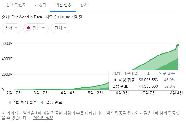 백신접종률은 일본이 더 높습니다. 팩스니 영수증이니 수기처리니해도 어쨌든 접종은 많이 했네요. 1회 이상 접종률도 높고, 2회 접종 완료인구비율도 두 배 이상입니다.