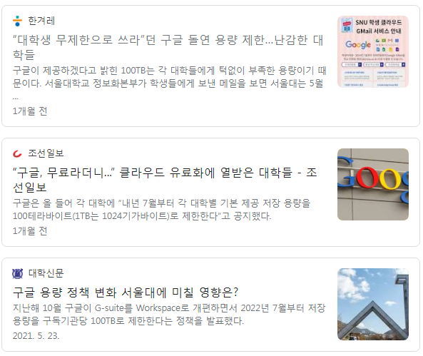 2021년 6월 27일, 서울대, 연세대, 고려대 등은 그동안 대학에 무료로 제공해 온 구글 메일 서비스를 유료로 전환한다는 방침을 확인했다. 대학 전산망을 담당하는 한국교육전산망협의회 등도 태스크포스(TF) 구성 등 공동 대응책 마련에 나섰다.