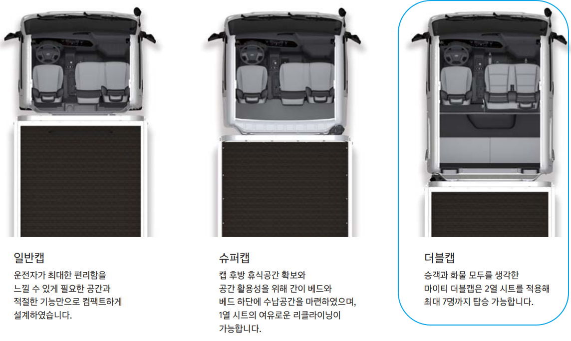 더블캡은 앞열에 3명, 뒷열에 4명해서 최대 7명 승차가능.1 슈퍼캡은 뒤가 빈 만큼 운전석 시트조절이 자유롭다고 하고, 운전석 뒤 공간은 간이침대2와 시트 아래 수납함이 된다고 합니다.