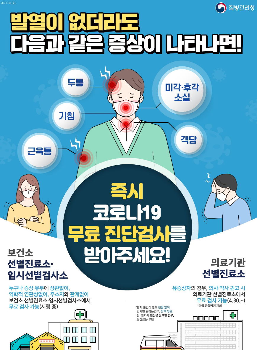* 각 보건소의 코로나19 검사는 무료입니다.