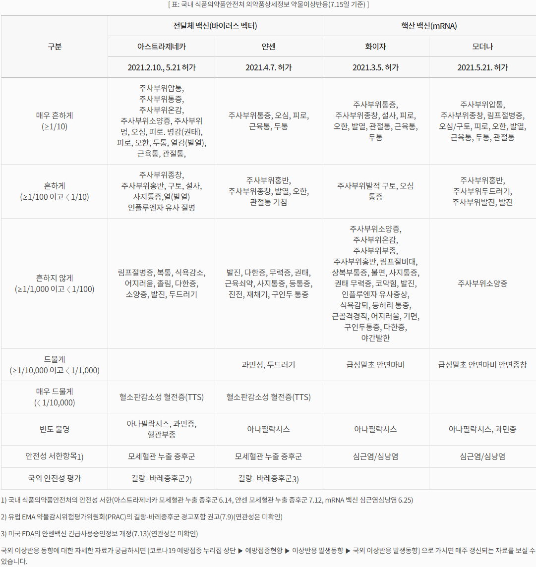 - 빈도 불명/ 안전성 서한항목/ 국외 안전성 평가.. 백신과 연관되었을 것으로 인정되고 인정사례가 있지만 아직 통계처리가 안 될 만큼 빈도가 낮거나, 아직 접수나 인정된 국내발생사례가 없고 해외에서 인정된 것.