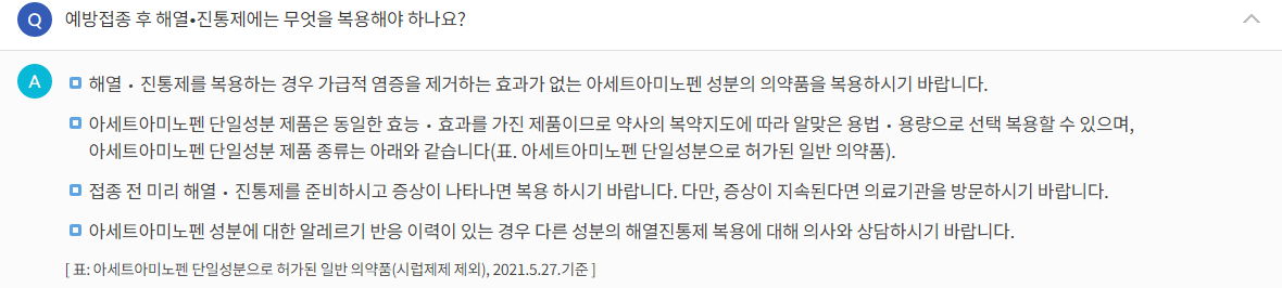 해열제 목록이 표시돼있는데, 아주 깁니다. 주사맞을 때 의사에게 물어보시고, 약국간다면 약국에서 코로나19접종받았다고 얘기하면 골라주겠죠.