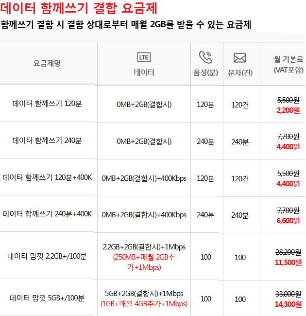데이터 함께쓰기 결합을 하지 않고 단독가입해 쓸 때 저 정도면 QoS요금제 중에서는 괜찮아보이는데요. 관심있다면 가입 전 확인필요.