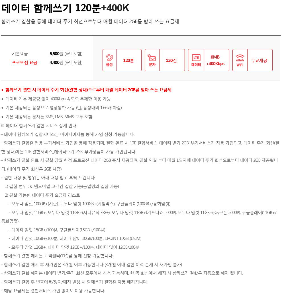 이건 "함께쓰기 결합 시 데이터 주기 회선(결합 상대)으로부터 매월 데이터 2GB를 받아 쓰는 요금제"인데, 설명 마지막줄을 보면, " 해당 요금제는 결합서비스 가입 없이도 이용 가능합니다"라고 적혀 있습니다. 그래서 아마 함께쓰기 결합하지 않고 단독가입으로도 쓸 수 있을 것 같은데, 자세히는 물어봐야겠죠. 이 요금제는 기본제공데이터가 없이 바로 400kbps QoS지만, 한편 올레와이파이가 무료제공됩니다. 대중교통을 이용하며 공공와이파이가 안 되면서 통신사와이파이는 될 때 쓸 수 있겠죠.