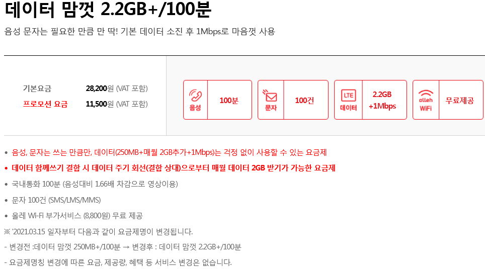 목록에서 아랫녀석, 데이터 맘껏 2.2GB+/100분 요금제가 눈에 띄네요.