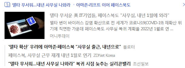 아마존, 페이스북 등 사무실근무 복귀계획 내년으로 연기. 마이크로소프트, 구글, 애플도 일단 연기. 월스트리트 금융권도 비슷. 마이크로소프트는 미국 내 사업장에 출입하는 모든 직원과 내방객에게 백신접종증명을 요구할 계획이고, CNN은 백신을 맞지 않고 사무실에 출입한 직원 해고.