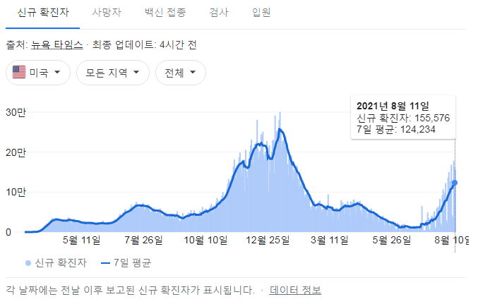 미국 동남부(이쪽에 백신접종률이 낮은 주들이 있을 겁니다)에서 환자 급증.