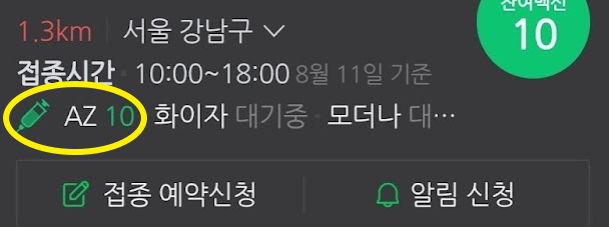 네이버앱에서 백신예약화면으로 들어가보면, 화이자, 모더나는 재고 0으로 '대기중'이지만 AZ는 재고가 약간씩 있는 경우가 있습니다. 많을 때는 10명 정도. 12명분 유리병을 따서 2명 마추고 10명분이 남는 식.