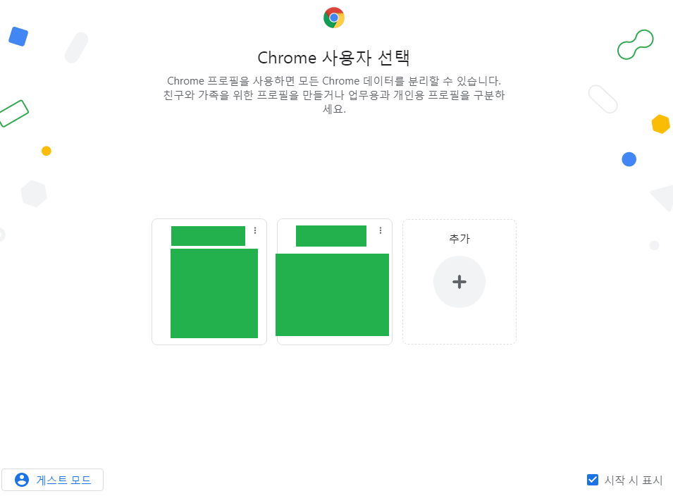 크롬 브라우저를 실행하면 등록된 프로필 중 어느 것으로 시작할지 물어봅니다. 게스트 모드도 있습니다.