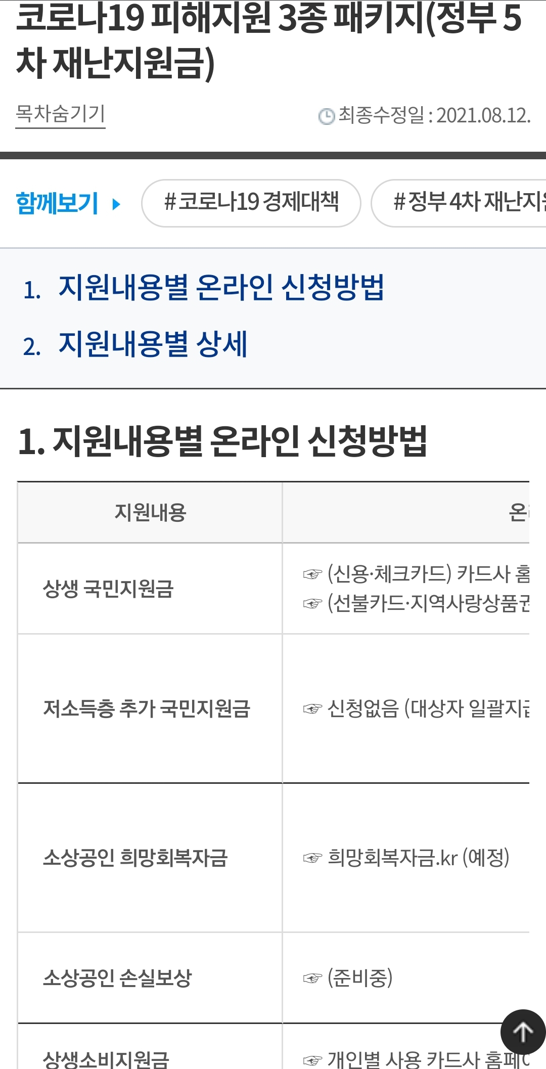 1.지원내용별 온라인 신청방법2.지원내용별 상세 1. 지원내용별 온라인 신청방법 지원내용 온라인 신청방법 문의 상생 국민지원금 ☞ (신용,체크카드) 카드사 홈페이지 (예정) ☞ (선불카드,지역