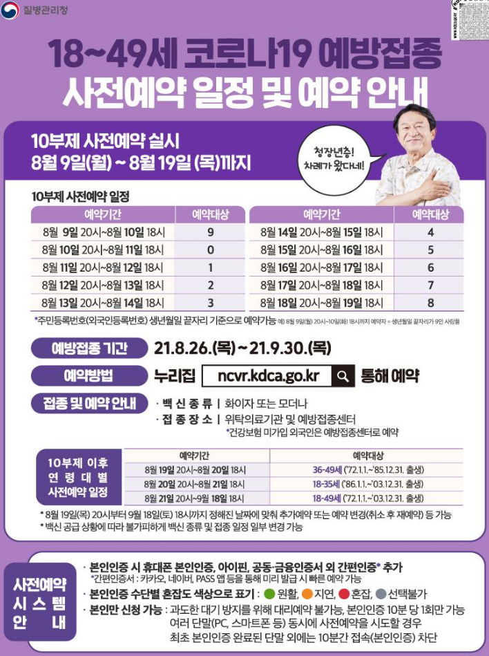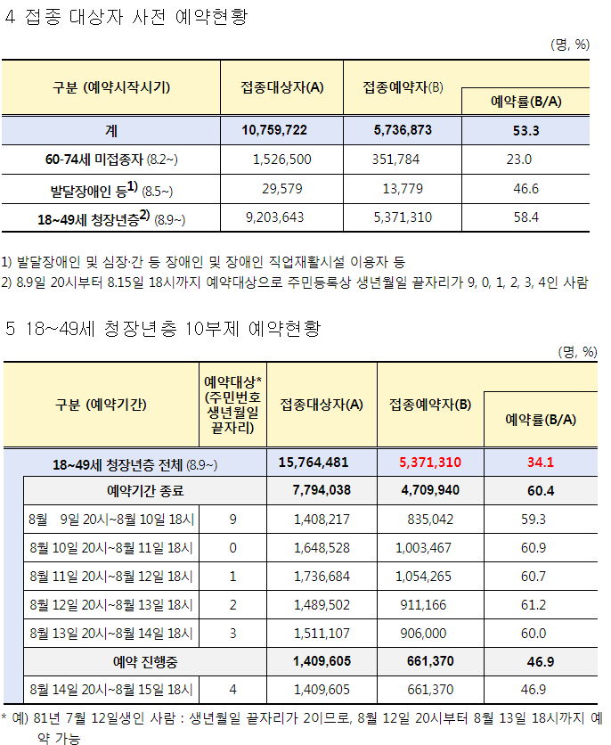 아래 표에서 고령층과 장애인 집계는 전체 기간에서 오늘까지 사전예약한 사람일 테니, 최종본은 아닙니다. 18~49세 10부제 대상인 사람도 미처 못했으면 19일 저녁부터 다시 해볼 수 있습니다. 위 표를 보세요.
