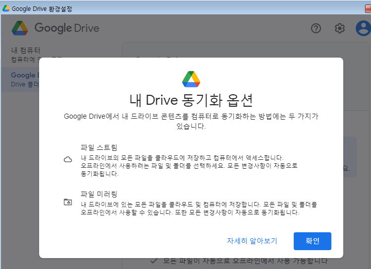 파일 스트림은 쉽게 말해 네이버 N드라이브처럼 쓰는 것이다. 컴퓨터 저장공간을 차지하지 않으며 업/다운 캐시용량 정도만 쓴다. 파일 미러링은 지금까지와 같은 동기화서비스다. 박스닷컴같은 것. 미러링이므로 컴퓨터 저장공간과 구글 저장소에 같은 데이터가 있으니 간이 백업 개념으로 쓸 수 있다. https://support.google.com/googleone/answer/10838124?hl=ko