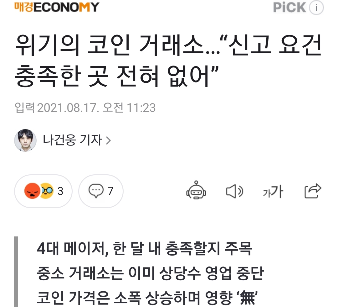 (앞서 언급한 다른 기사에 따르면 정부는 실명계좌조건을 충족하지 못할 경우 모조리 영업중단시키는 것은 여파가 너무 크니 원화거래를 금지하는 걸 고려란다는 기사. 그래서인지 코인가격은 큰 영향은 없는 듯 하다고. 이 악재를 묻을 오를 건수가 요즘 좀 있긴 하다지만)