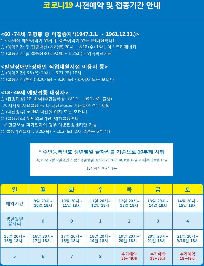| 코로나19 집계(2021.8.19. 0시기준)/:/ 2152명 /:/ 18~49세 예방접종 온라인 사전예약 추가예약/:/ 국가별 예방접종률 현황 (0) | 2021.08.19 |