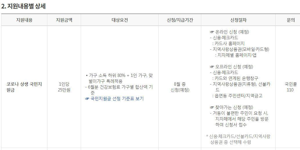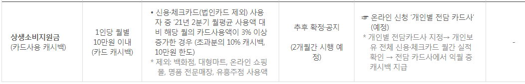 1.지원내용별 온라인 신청방법2.지원내용별 상세 1. 지원내용별 온라인 신청방법 지원내용 온라인 신청방법 문의 코로나 상생 국민지원금 ☞ (신용,체크카드) 카드사 홈페이지 (예정) ☞ (선불카