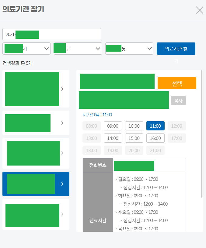 지역을 정하면 예약가능한 병의원과 시간대가 뜬다. 병원이 회색처리돼있지 않아도 예약가능시간대가 없을 수 있다. 휴일일지도 모르겠다.