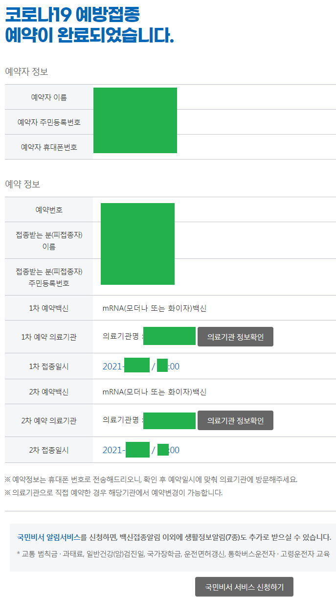 예약을 마치면, 이렇게 1차, 2차 접종일과 시간을 보여준다.