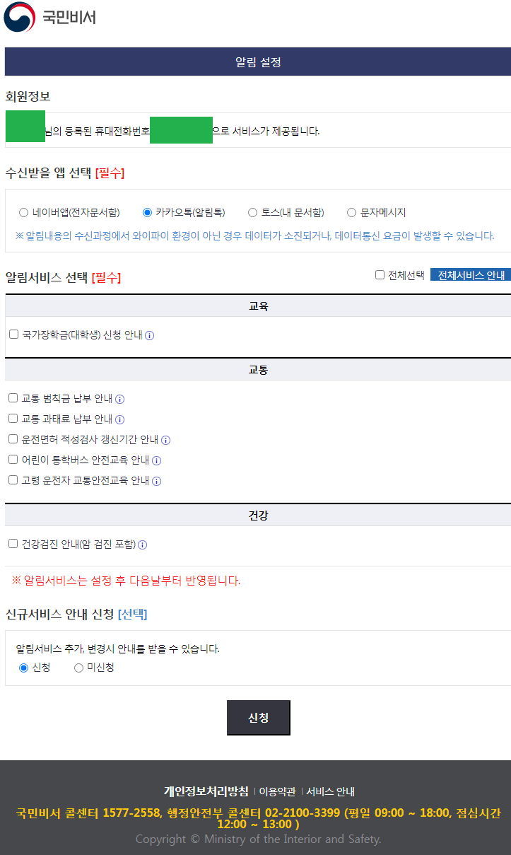 국민비서알림서비스는 기본적으로 도로교통과태료/범칙금, 일밤(암)건강검진알림, 국가장학금, 운전면허적성검사/운전자교육 알림 등록인데, 각각의 서비스를 관장하는 기관이나 병원을 이용한 적 있다면 이거 안 해도 개별적으로 SMS알림등록신청한 적 있을 것이다.