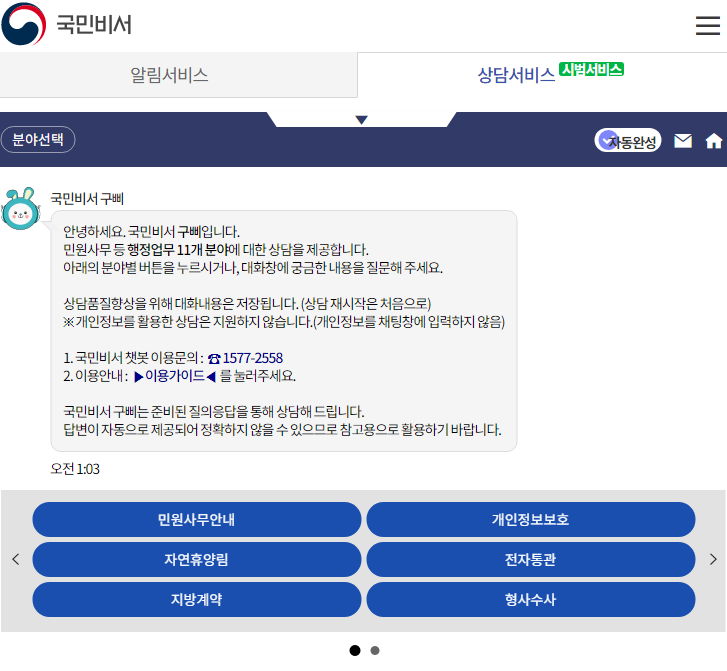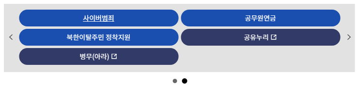 민원사무안내/개인정보보호/자연휴양림/전자통관/지방계약/형사수사/사이버범죄/공무원연금/북한이탈주민 정착지원/공유누리/병무 로 카테고리.