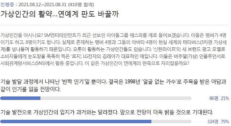 얼마 전에 모 신문은, 가상아이돌이 앞으로 대세가 되겠냐는 설문을 한 적 있습니다.