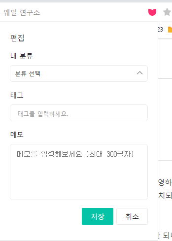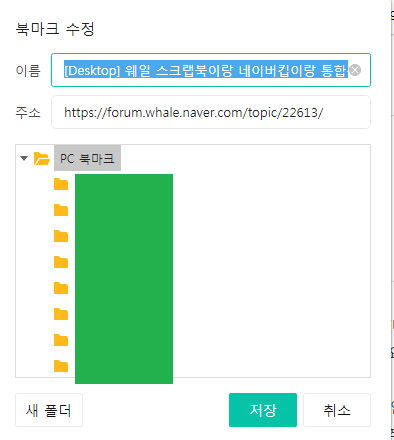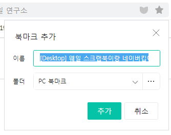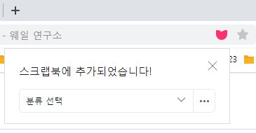 웨일브라우저 주소창 오른쪽 끝에, 스크랩북에 넣는 하트표시와 크로뮴기반 공통인 북마크 별표1가 있어 그걸 사용합니다.