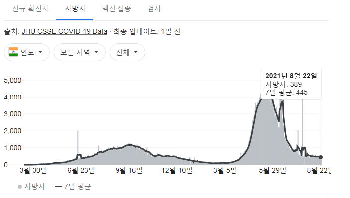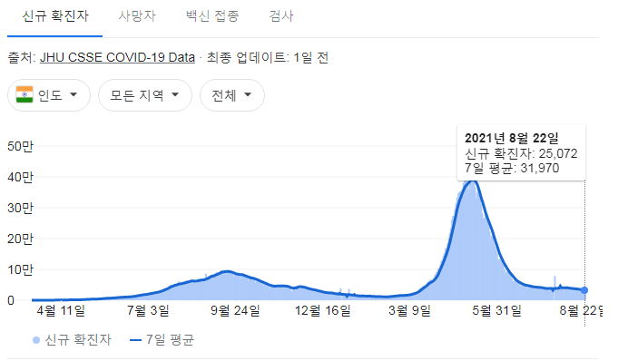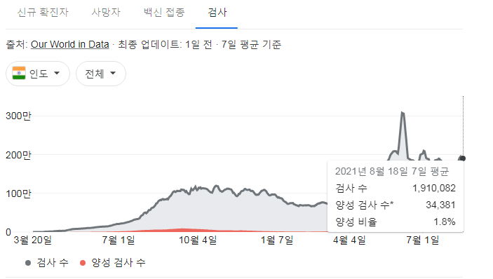 우리가 하루 10~15만건 정도 검사한다는데, 인도는 하루 거의 수백만 건씩 검사. (저 검사건수그래프는 정확하지 않을 수 있습니다. 구글 그래프에 나온 우리나라 일일 검사건수는 질병청 보도자료의 1/3정도에 그칠 때도 있습니다)