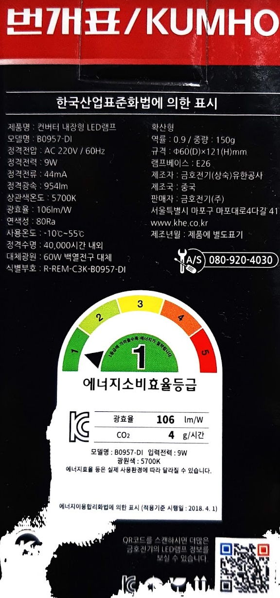 금호전기 번개표 9W LED 전구(B0957-DI) 에너지소비효율 1등급 본문