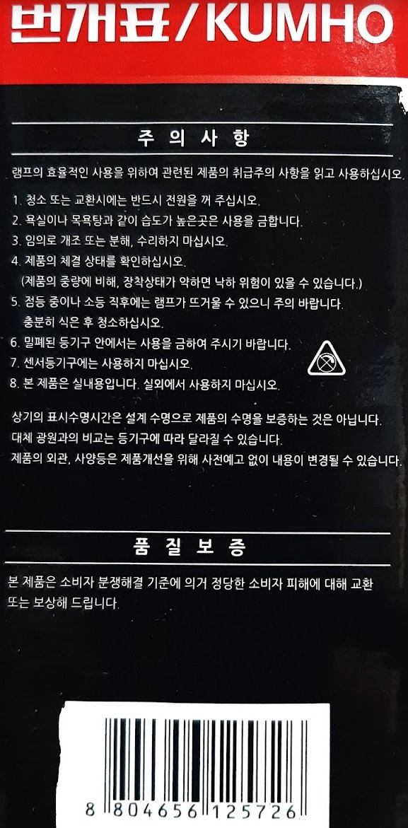 - 필립스, 오스람, 금호 등이 표시하는 이 부분이 제품이 아니라 LED수명아니냐는 의문도 돌아다닙니다만, 일단 2022년기준 오스람은 E26소켓용 벌브기준 가정용 15000시간, 상업용 2만시간이라고 표시하고 있더군요. 참고로 2022년에 판매 중인, 같은 포장디자인을 사용하는 번개표의 염가형 제품은 소비효율등급 3등급에 정격수명은 8천시간입니다. [본문으로]