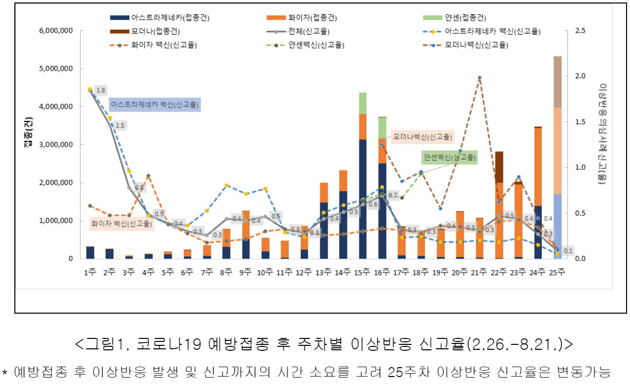 그리고 초기 신고율이 높았던 이유는, 초기에는 시설에서 단체생활하는 몸약한 취약계층도 맞았지만, 의료체계 붕괴를 막기 위해 의료관계인력(의사, 간호사, 간호조무사, 요양보호사, 약사, 보건소공무원과 중앙의 역학조사관 등, 응급, 후송, 구조관련 종사인력 등)이 집중적으로 맞은 이유도 있을 것이다. 이 사람들은 정상과 이상의 몸상태 차이를 가장 확실하게 아는 사람들이며, 이상반응 보고체계도 확실하게 확립돼있고 전화통만 붙잡고 있지 않아도 된다. 실제로 봄철 의료인력의 이상반응(부작용) 설문을 보도한 매체들 기사를 보면 이 주사는 꽤나 강하게 온다는 반응이 많았다.