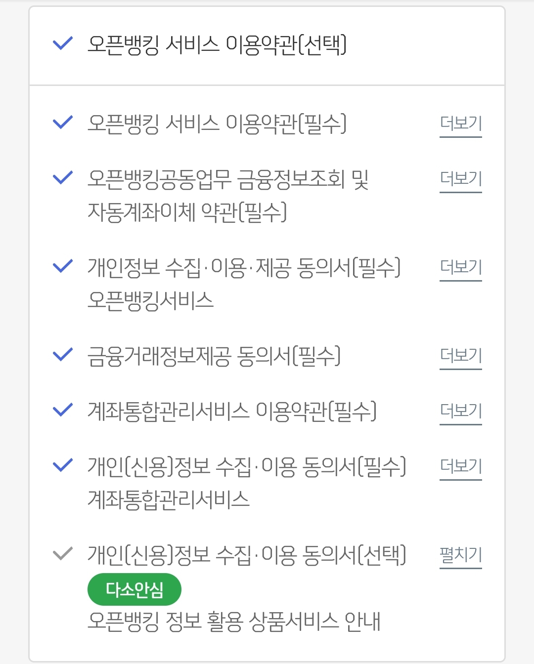 사용 전에 동의해야 하는 약관이 꽤 많습니다. 그 중 맨 처음만 앱을 실행하는 데 필요하고, 나머지는 해당 부가서비스를 이용할 때 해주면 됩니다.