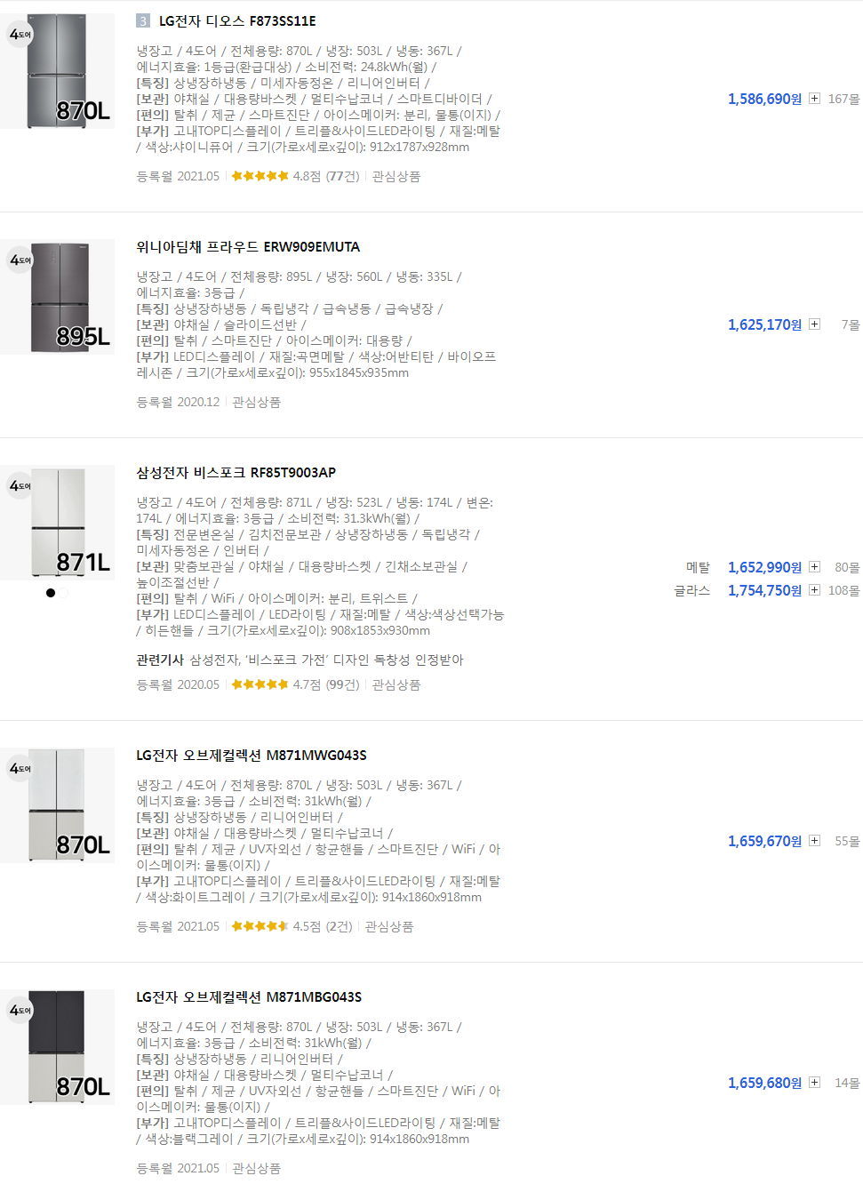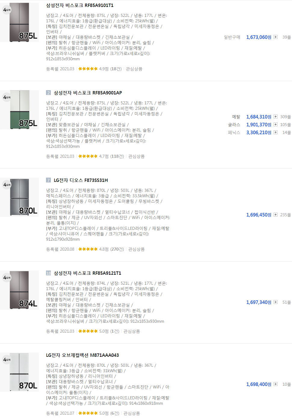 냉장고 사이즈를 입력해 찾는 옵션도 보입니다. 이건 필요한 분이 계실 겁니다.