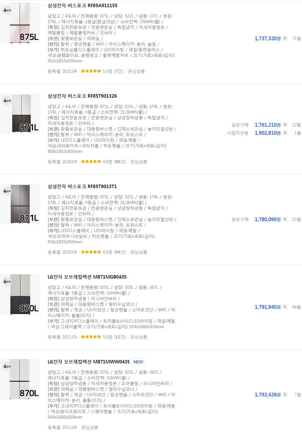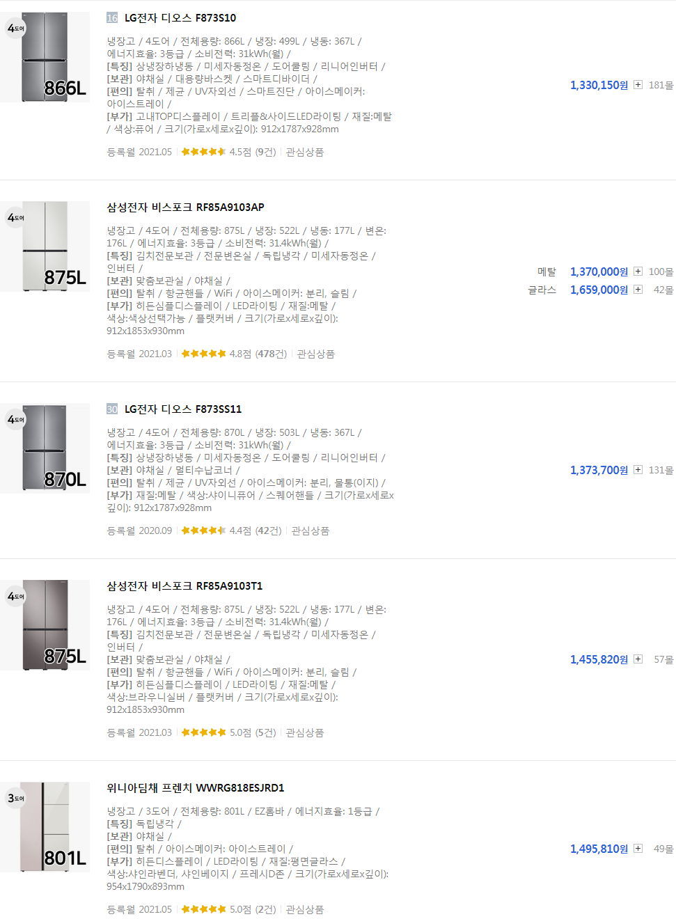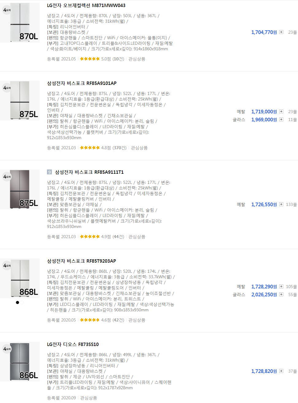 교훈3. 요즘 870리터 냉장고들, 가로와 깊이가 몇 년 전 800~856리터대와 비슷합니다. 높이는 약간 높은 게 있을 수 있습니다. 그래도 높이차는 빌트인만 아니라면, 일단 집안에 세워만 놓으면 그 다음부터는 생각보다 느껴지지 않는 부분이라서, 10리터+5리터짜리 김치통 하나가 더 들어간다 생각하면 꽤 괜찮은 것입니다.