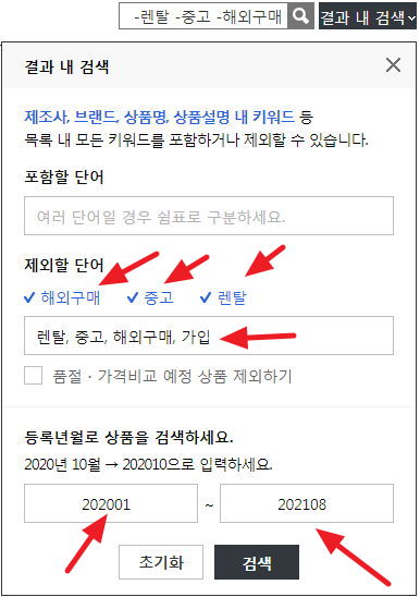 요즘 다나와 제품목록 필터. 아래와 같이 정할 수 있습니다. 제외할 단어에서 "가입"은 직접 적어준 것. 각 단아를 쉼표로 구분합니다.