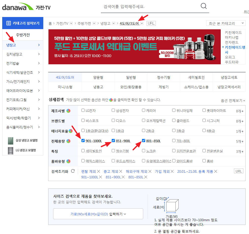 8백리터급 이상을 찾을 테니까, 옵션 "전체용량"에서 801리터부터 체크해줍니다. 어차피 가격정렬하면 900리터 이상은 앞에 안 나옵니다.