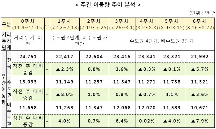 거리두기 강화로, 8월 하순의 1주간 휴대전화추적기준 이동량이 5%이상 감소했다고 합니다. 잘 따라줘서 고맙고 앞으로도 잘 따라달라고 당부하는 보도자료.