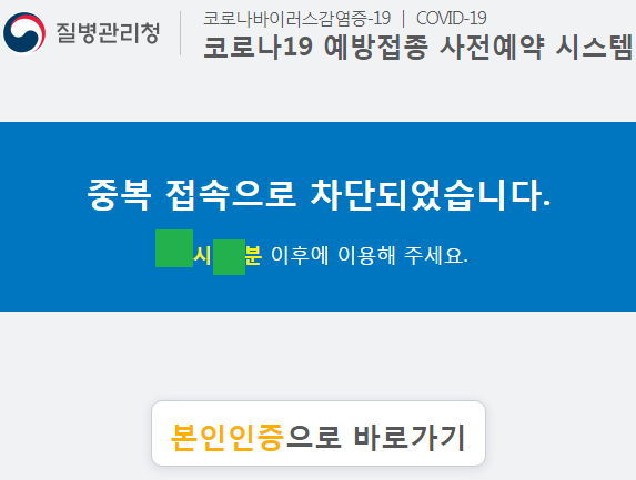 * 10분 뒤에 재접속하라고 쓴 이유는, 예약이든 취소든 본인인증하고 이전에 처리한 업무가 있으면, 10분이 지나기 전에 또 접속하면 중복차단알림이 뜹니다. 아래 화면처럼. (차단돼도 차단된 채로 있는 것은 아니고 10분 지나면 풀리니 걱정할 일은 없습니다)