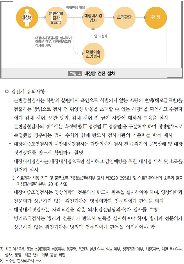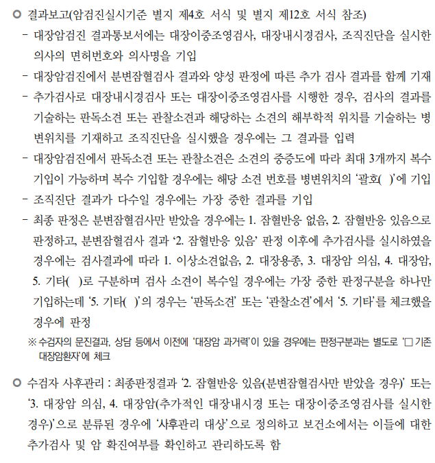 그 중 2021년판 사업안내서에서, 대장암부분 스크린샷입니다. 검진과정, 분변잠혈검사결과가 양성일 때의 다음 절차 등. 원래 사업시행주체인 공무원과 의료기관용입니다.