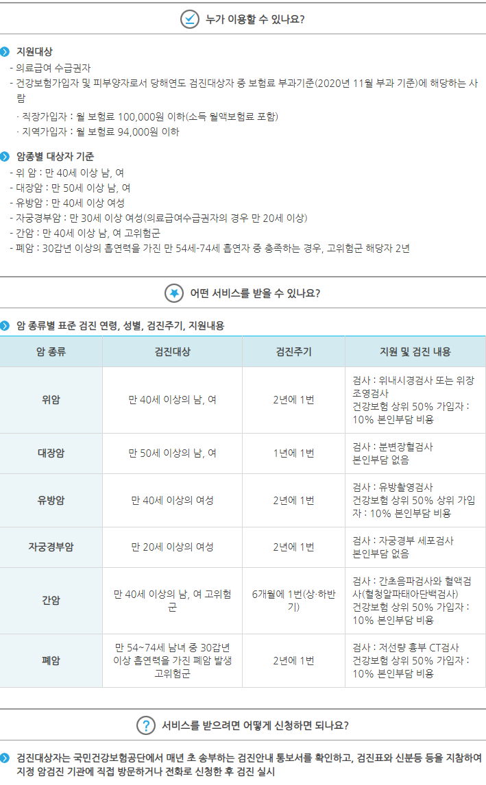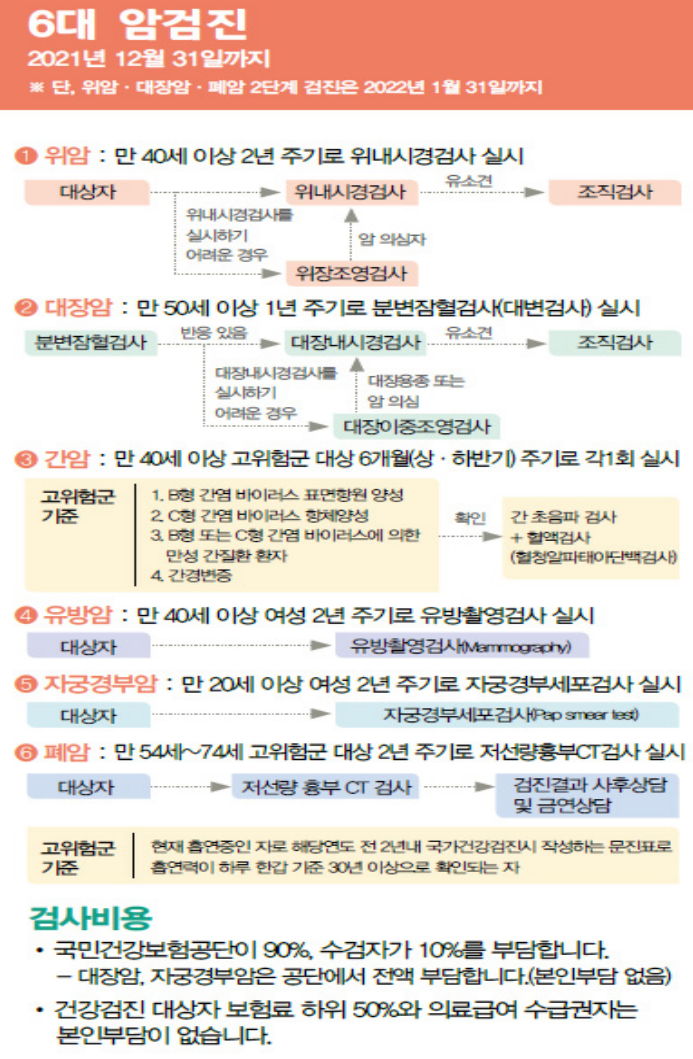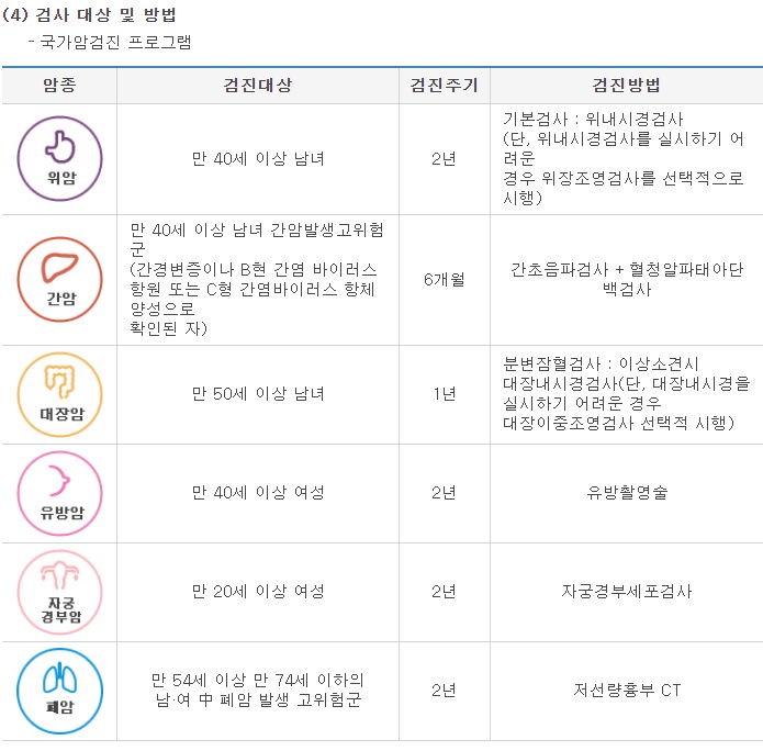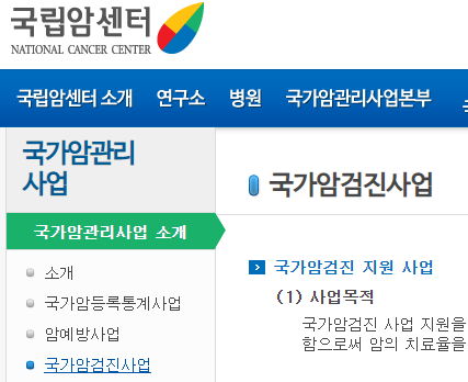 국가암검진사업 Home 국가암관리사업 국가암관리사업 소개 국가암검진사업 국가암검진 지원 사업 (1) 사업목적 국가암검진 사업 지원을 통하여 우리나라 국민의 사망원인 1위인 암을 조기에 발