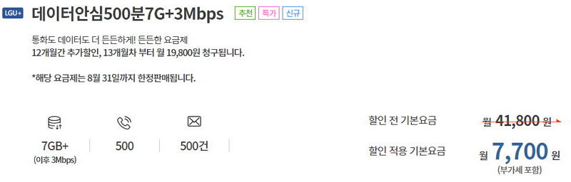 1년간 할인요금 월 7700원, 13개월째부터 19800원. 기간한정할인요금제입니다. 그 부분은 확인.