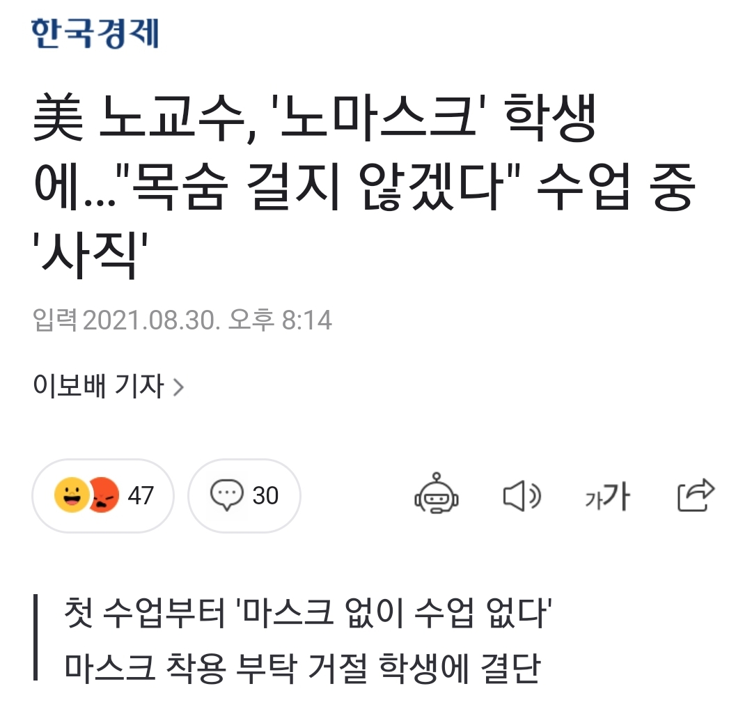 美 노교수, '노마스크' 학생에…"목숨 걸지 않겠다" 수업 중 '사직'